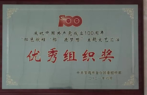 为庆祝中国共产党建党100周年,乐鱼leyu(中国)全体党员于2021年6月30日参加金台区非公和社会组织系统庆祝中国共产党成立100周年“红色航程‘船’递梦想”主题文艺汇演暨“两优一先”表彰大会。 文艺演出中,公司党员集体表演配乐诗朗诵《南湖的红船,让理想启航》,并获得由中共宝鸡金台区委组织部颁发的“优秀组织奖”。