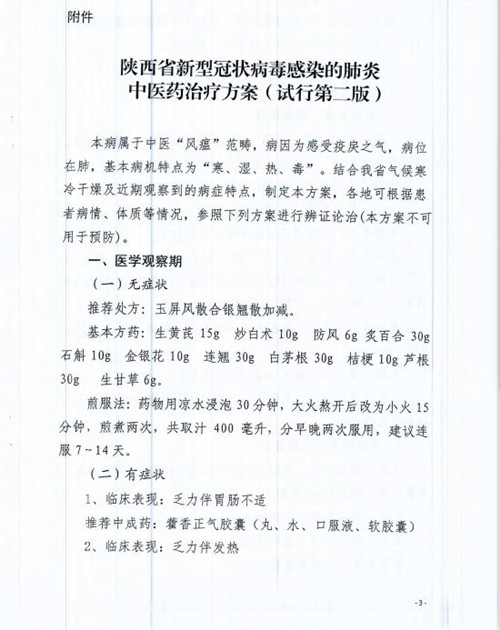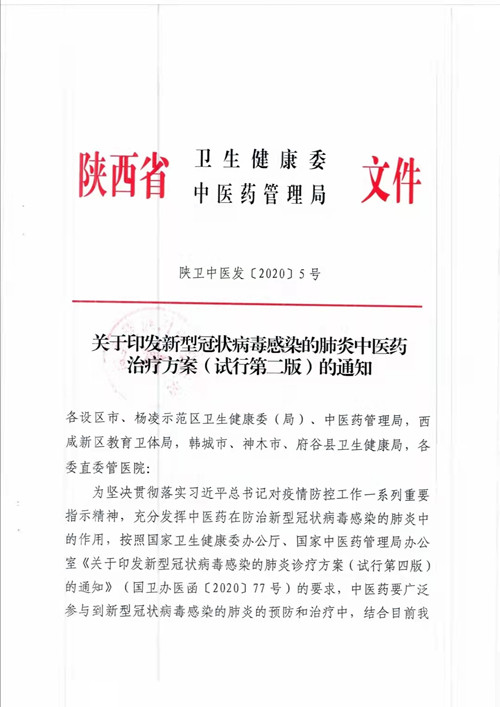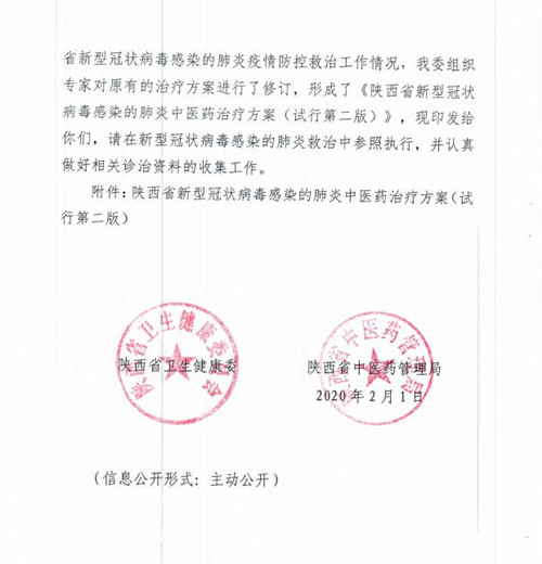2020年2月1日,陕西省卫健委、陕西省中医药管理局发布了《关于印发新型冠状病毒感染的肺炎中医药治疗方案(试行第二版)的通知》。