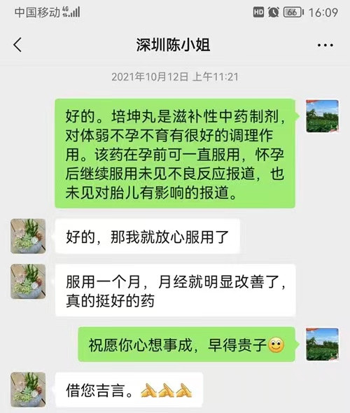 一起产品质量投诉终于圆满解决,随着时间的飞逝,这起事件也逐渐淡出了汪总工的记忆。 时间过得飞快,一晃一年多过去了。2022年12月11日,汪总工突然收到陈女士一则短信:冒昧打扰了,向您报个喜,我顺利怀孕生子,宝宝今天满月了!很感谢你们,也很感谢你们的良心好药!……汪总工听后十分欣慰,他向陈女士道贺的同时,也将这个喜讯及时向科室的同事们作了通告。大家为既为陈女士高兴,也啧啧称赞培坤丸的神奇疗效。